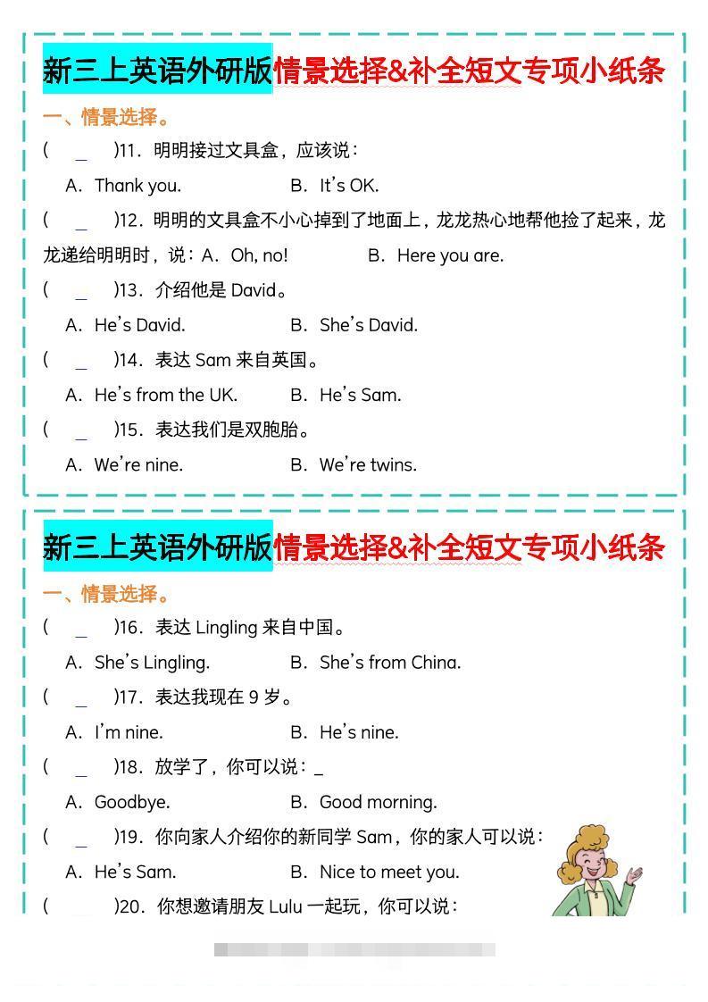 新三上英语外研版情景选择补全短文专项小纸条admin2个月前发布关注私信000新三上英语外研版情景选择补全短文专项小纸条此内容为付费资源,请付费后查看¥9.9免费免费暂时无法购买,请与站长联系格式pdf页数10 页大小2.29 MB付费资源 ——预览已结束,还剩8页未读——开通会员后可免费下载高清完整文档 THE END小学英语 喜欢就支持一下吧收藏